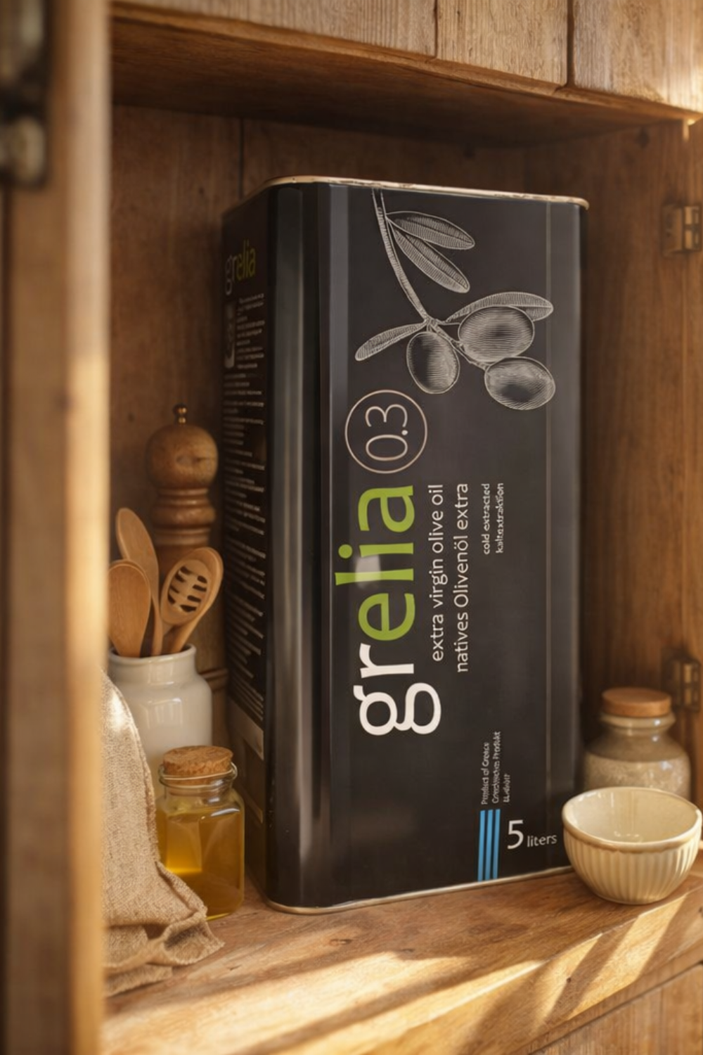 Wybierz Grelia 0,3% 5 l, jeśli chcesz mieć większy zapas dobrej greckiej oliwy extra virgin do codziennego używania i prostych dań na zimno.