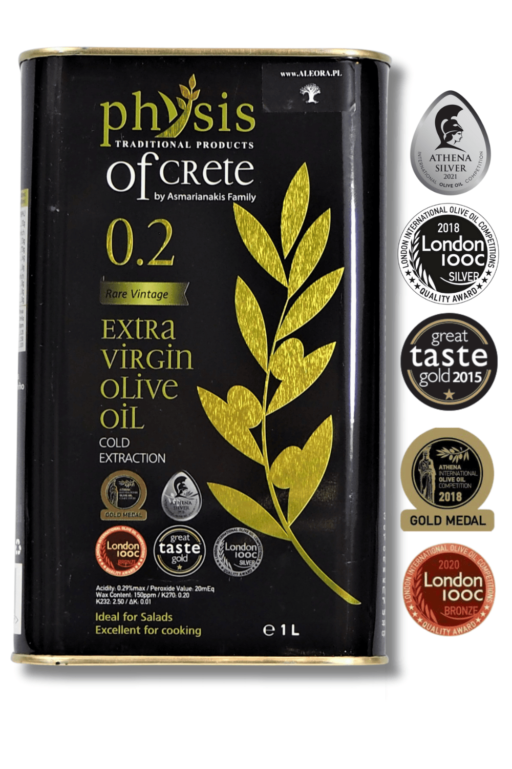 Physis of Crete 0,2% 1L to grecka oliwa z oliwek extra virgin z Krety, powstająca z oliwek Koroneiki rosnących w regionie Lasithi / Mirabello. Wyróżnia się bardzo niską kwasowością, owocowym aromatem, świeżym smakiem i praktycznym opakowaniem w metalowej puszce z dziubkiem.