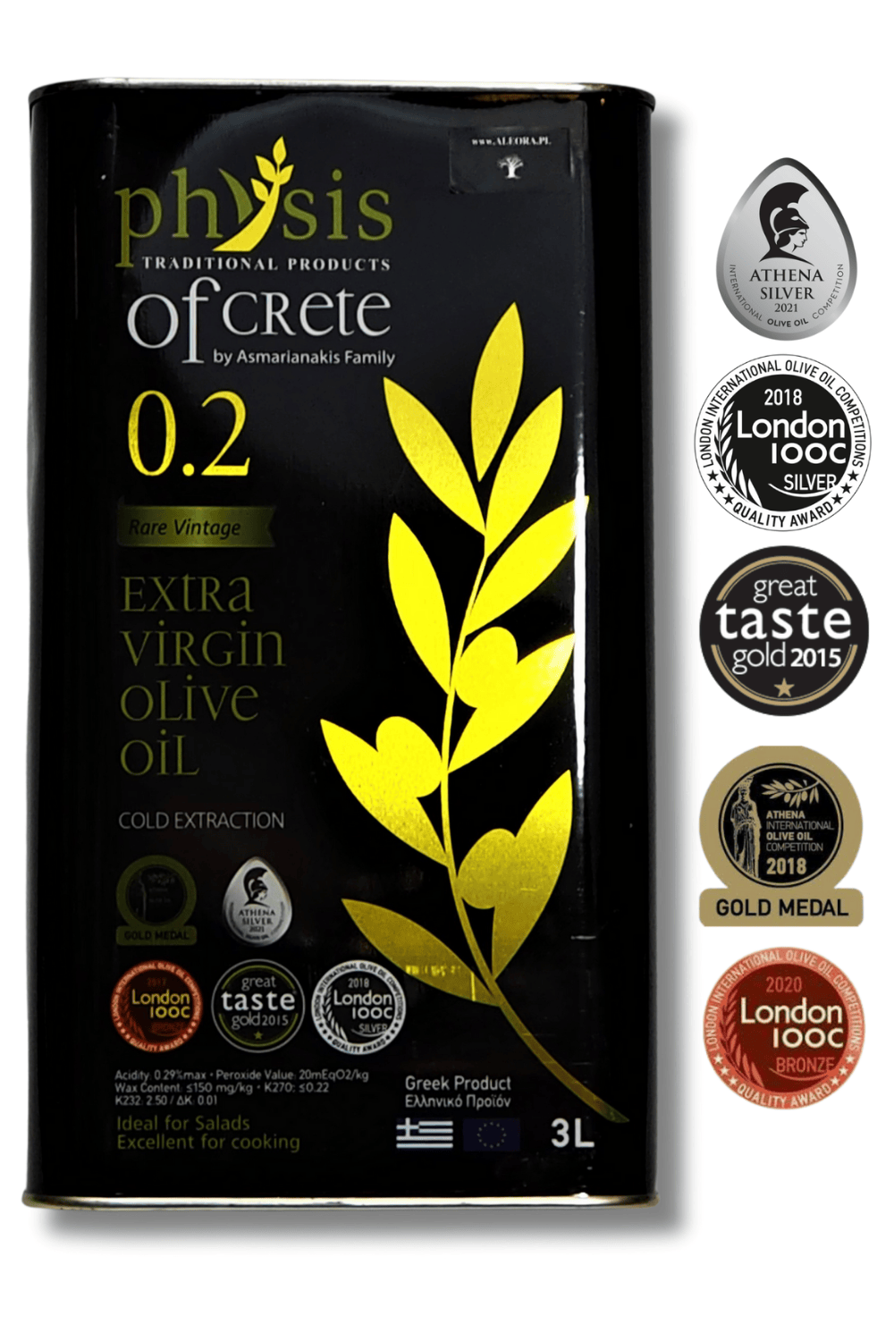 Physis of Crete 0,2% 3L to grecka oliwa z oliwek extra virgin z Krety, przygotowywana z oliwek Koroneiki rosnących w regionie Lasithi / Mirabello. Wyróżnia się bardzo niską kwasowością, owocowym aromatem, świeżym smakiem oraz praktycznym opakowaniem w metalowej puszce 3L z dziubkiem.