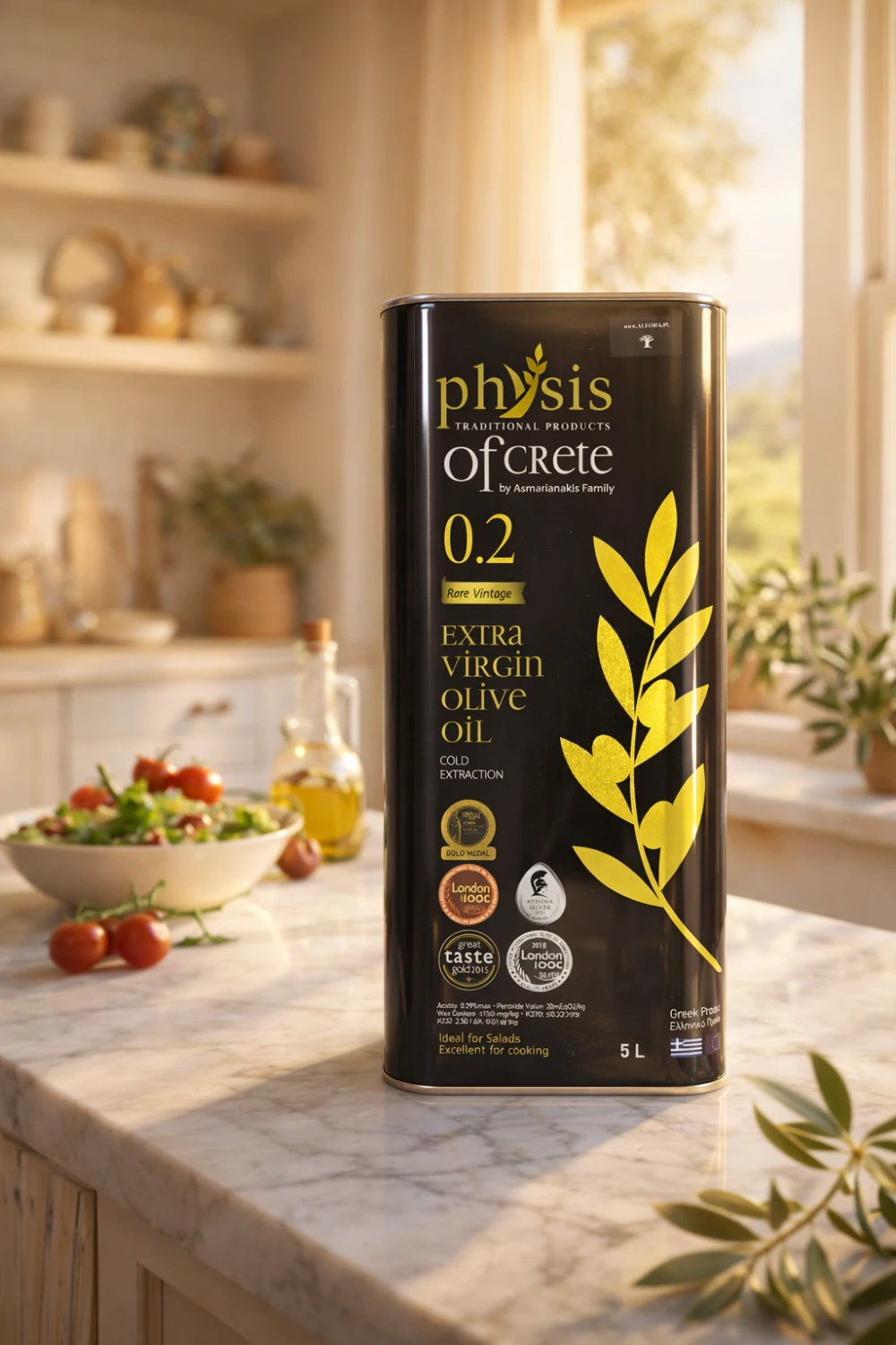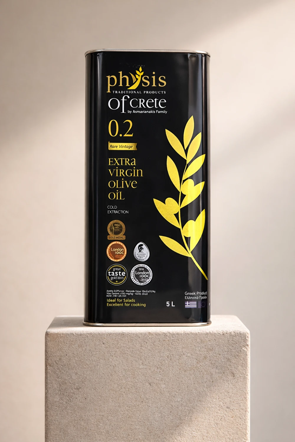 Physis of Crete 0,2% 5L to grecka oliwa z oliwek extra virgin z Krety, stworzona z oliwek odmiany Koroneiki. To wariant przeznaczony dla osób, które zużywają oliwę regularnie i chcą mieć większy zapas dobrej jakości produktu do codziennego gotowania, sałatek i dań inspirowanych kuchnią śródziemnomorską.